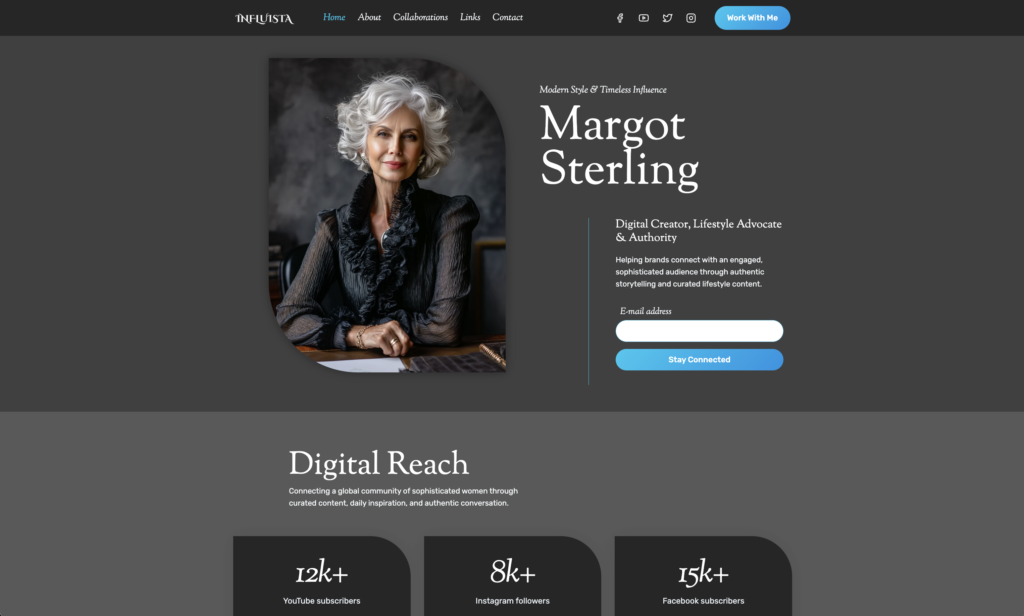 While every other website template seems to be designed for twenty-somethings chasing likes and followers, Influista was created for the woman who has already arrived. She knows her worth, she knows her audience and she knows that style, wisdom & knowledge, like fine wine, improves with age!
