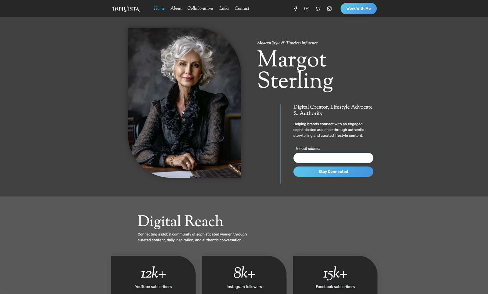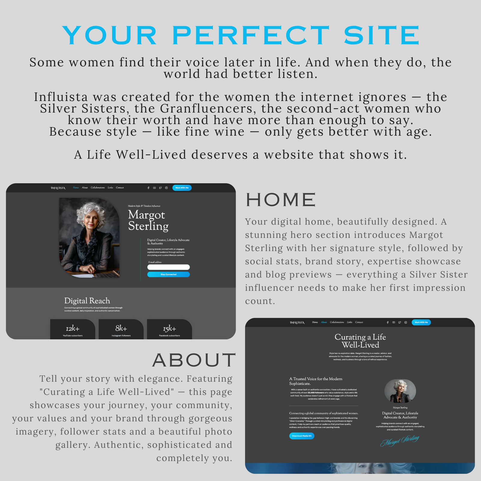Because the internet needs more of YOU. More wisdom, more authenticity, more style earned through living. Influista gives you the professional online home you deserve — without the professional price tag.