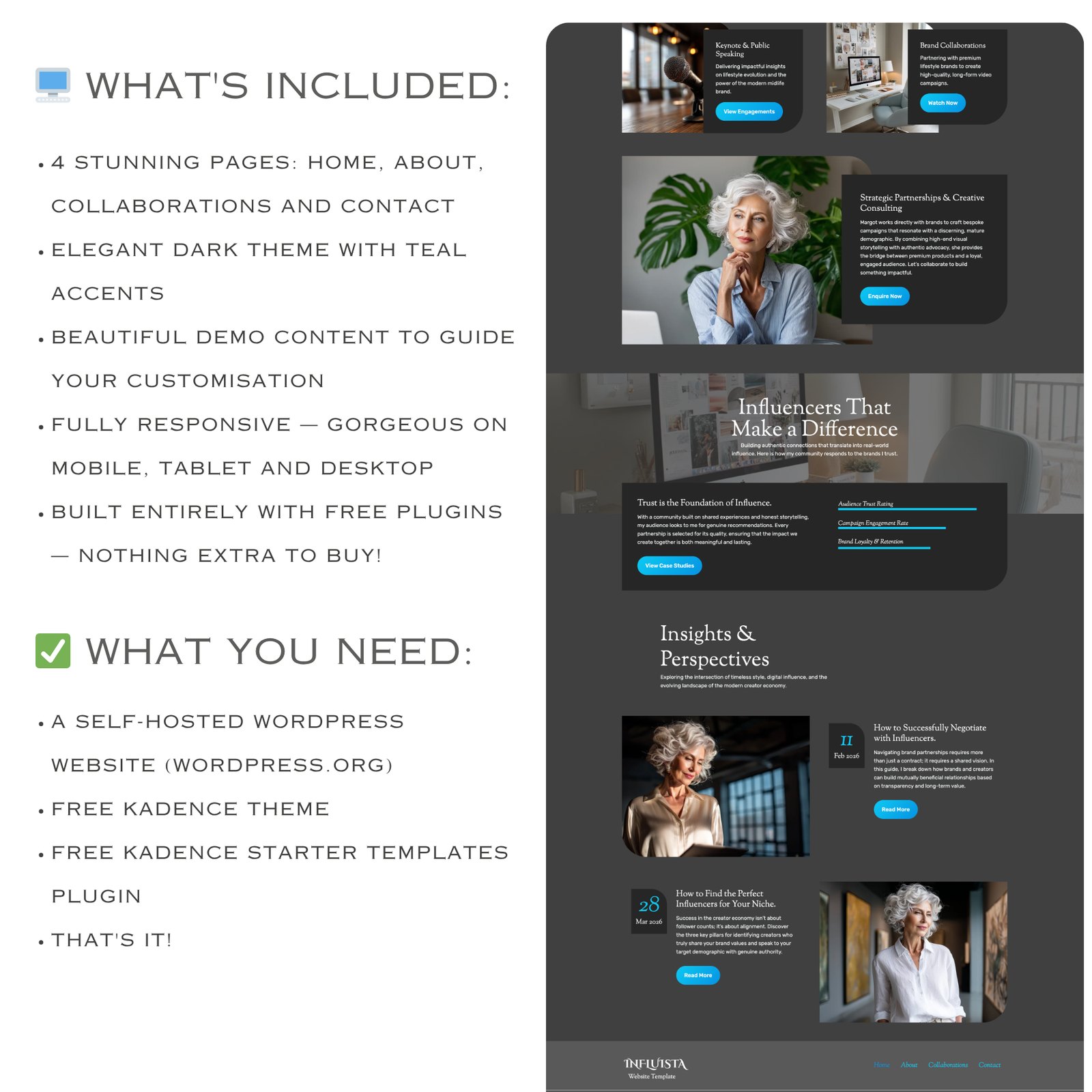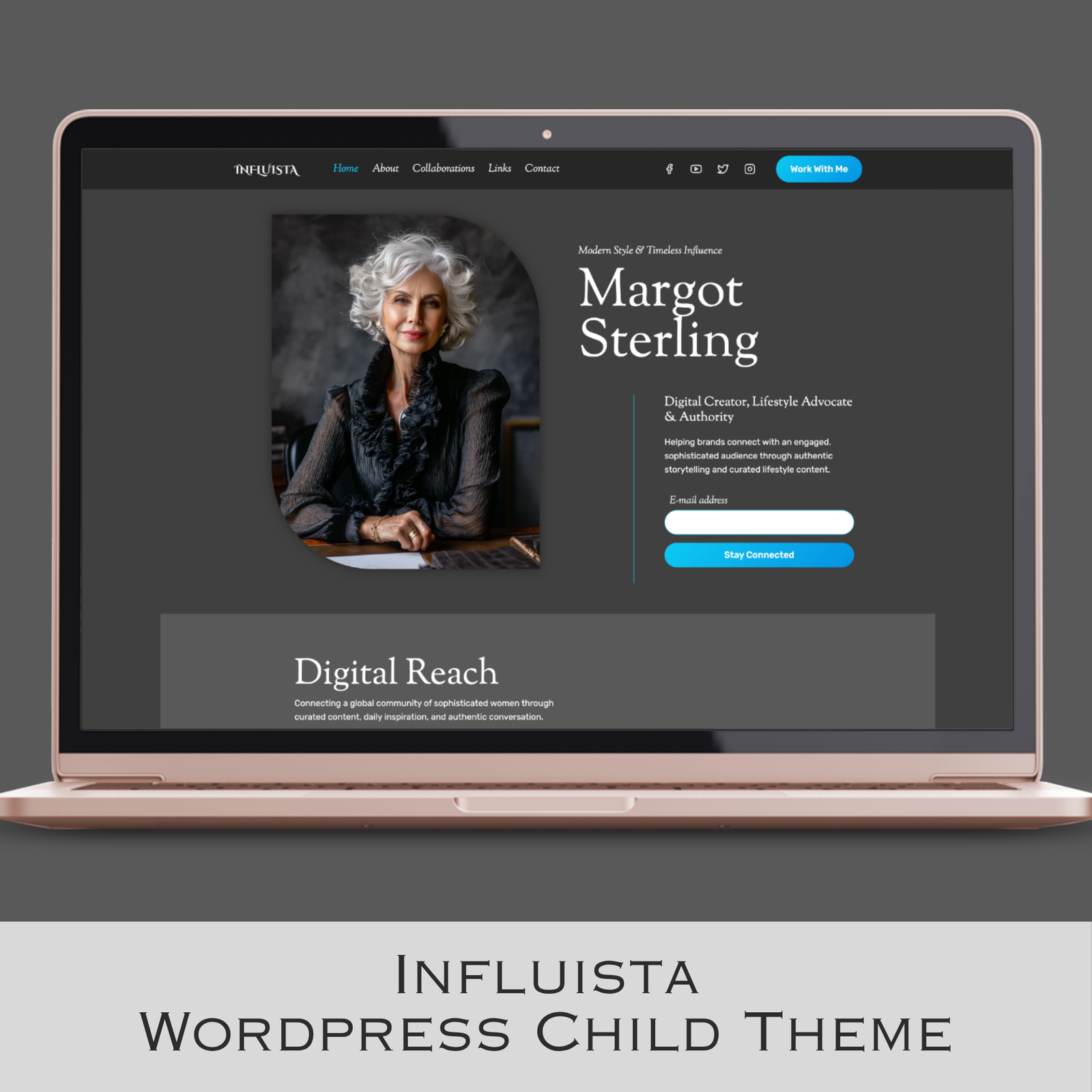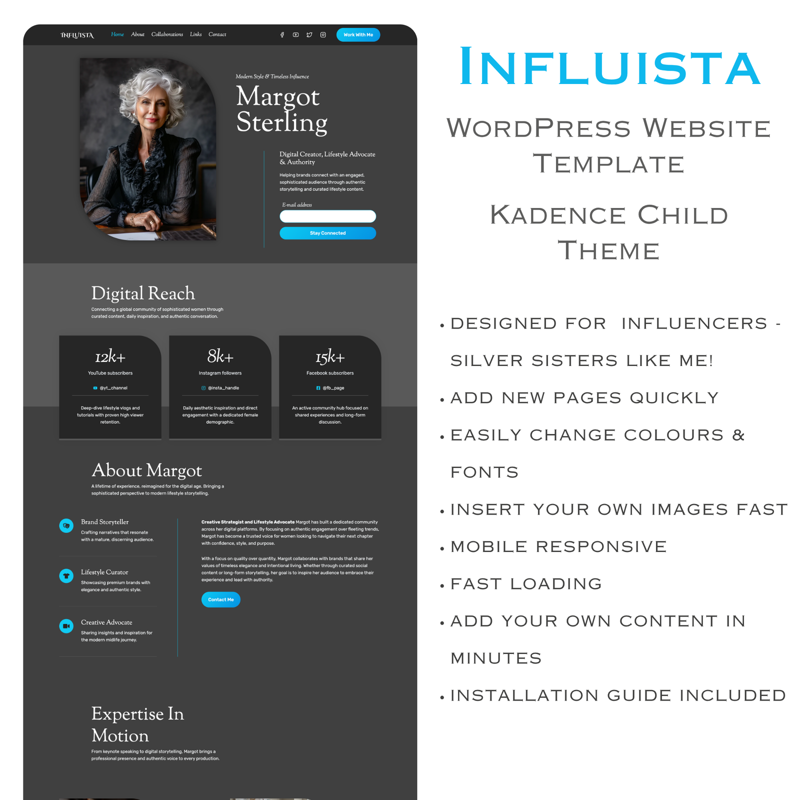 Influista Child Theme is a beautifully designed, ready-made WordPress website template built specifically for Silver Influencers, Granfluencers and Second-Act women who want a sophisticated, elegant online presence without the web designer price tag. Install, personalise and go — built entirely with free plugins, nothing extra to buy!