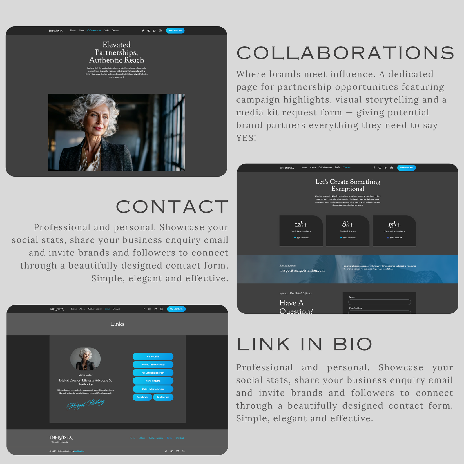 Influista is a beautifully designed, ready-made WordPress website — built specifically for Silver Sisters who want a sophisticated, elegant online presence without paying expensive web designer prices.